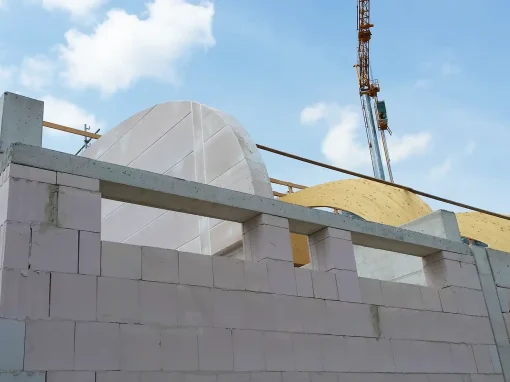 - Erdgeschoss aus Stahlbeton-Stützen, Porenbeton und Fertigteil-Wandelementen
